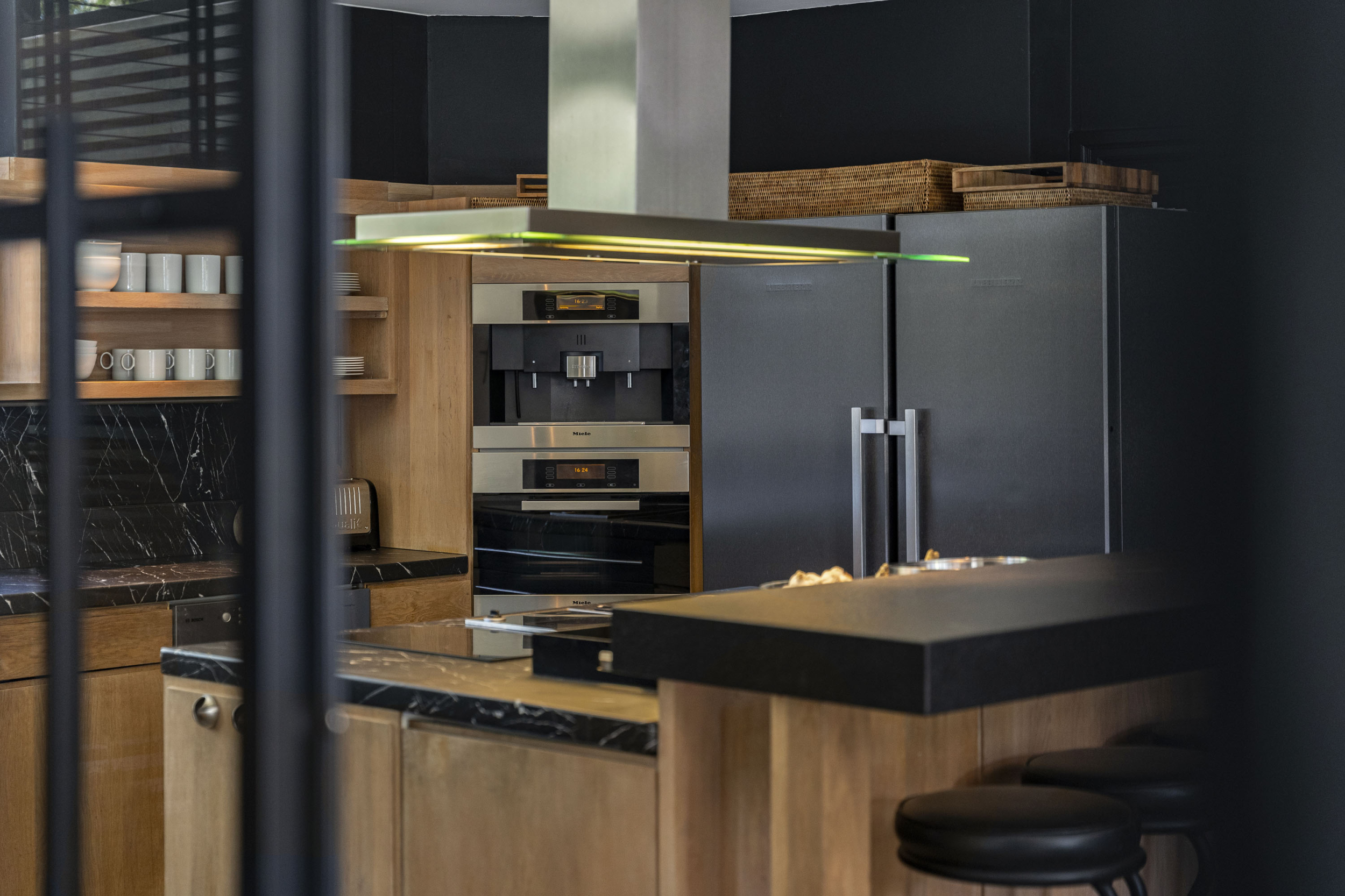 De linkervleugel begint met de keuken, vanuit de woonkamer bereikbaar door dubbele zwart stalen deuren. Op een prachtige leistenen vloer van circa 45 m2 staat een naturel eikenhouten woonkeuken met granieten werkblad en een kookeiland met verhoogde bar. De keuken is volledig uitgerust, met een stoomoven, oven en koffiemachine van Miele, plus een recente Liebherr koelkast. Er is voldoende ruimte voor een royale eettafel, waar je niet alleen gezellig kunt dineren, maar ook kunt genieten van een prachtig groen uitzicht.
