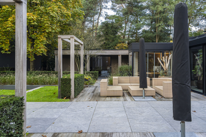 En dan… de tuin! Onder architectuur van PUUR Groenprojecten is de tuin smaakvol verdeeld in verschillende vlakken met natuurstenen trappen en houten terrassen, voor een boeiend lijnenspel vanaf het zonneterras. Ook de privacy is uitermate goed; je hebt vanuit de tuin een prachtig uitzicht op het bos en kunt toch optimaal genieten van de zon. Een roestvrijstalen designpaal met schommel-ei voegt een speels accent toe. Achter in de tuin is nog een discreet opgestelde houten schuur met grote deuren, handig voor tuinmeubelen en gereedschap. Aan de achterzijde van de schuur is een overdekte ruimte waar het hout voor de open haarden droog kan wachten op de winter.