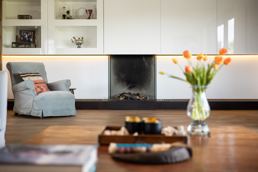 De living is ingedeeld in een royaal zitgedeelte met twee gashaarden en een eetgedeelte met vaste L-vormige bank. De open keuken vormt een waar statement: een marmeren kook-/spoeleiland met geïntegreerde opbergruimte die elektrisch omhoog komt, apparatuur van topmerken zoals Gaggenau, Miele en een Quooker, en een stijlvolle koffiecorner met rookglasdeuren. Alles is ontworpen om praktisch, stijlvol en indrukwekkend tegelijk te zijn.