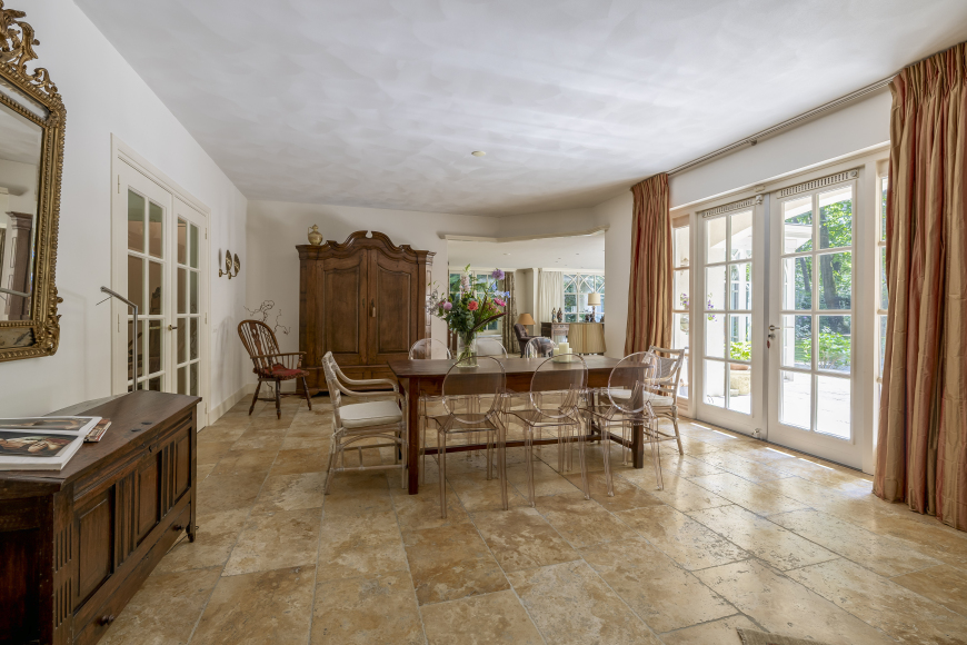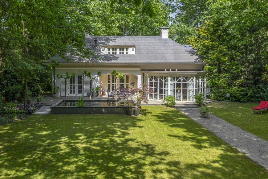 Aan de achterzijde van de living bevindt zich de tuinkamer, een lichte ruimte met ramen aan alle zijden, die een prachtig zicht geven op de tuin.