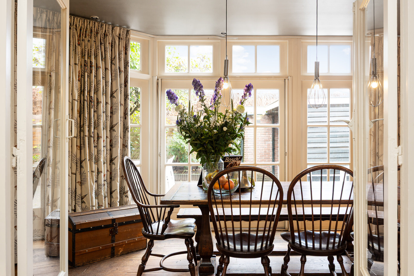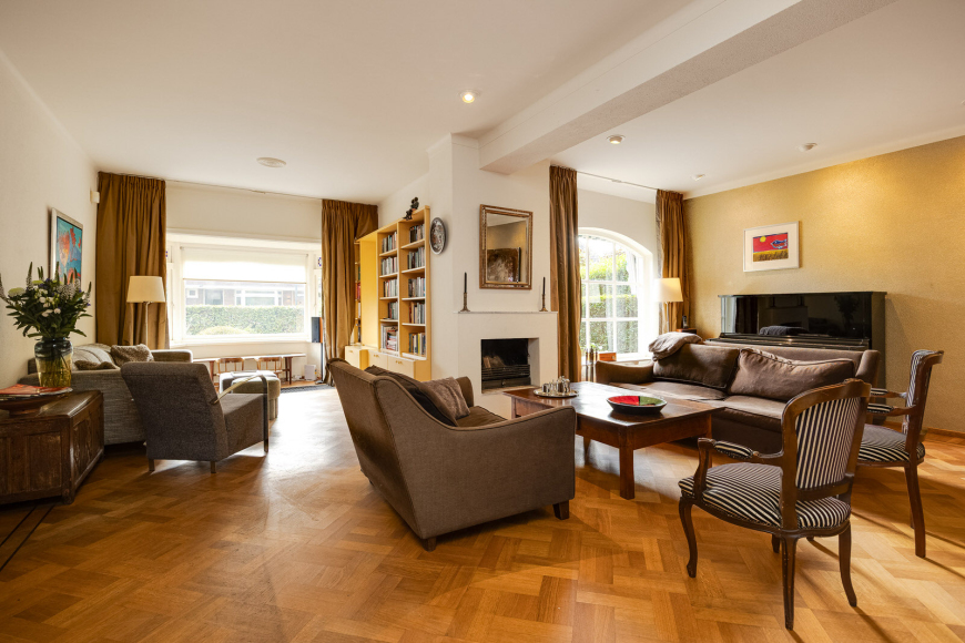 De woonkamer is een elegante, lichte ruimte met een klassieke erker met glas-in-lood en een groot toograam met roedeverdeling, beide met zicht op de voortuin en voorzien van een markies als zonwering. De houten mozaïekparketvloer met dubbele bies (2006), open haard en convectorputten zorgen voor stijl en comfort. De openslaande deuren geven de keuze tussen een open verbinding met de woonkeuken of juist twee afzonderlijke leefruimtes.