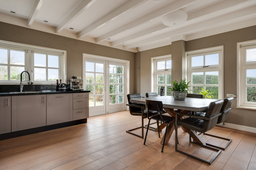 Achter een andere schuifdeur ligt de (tweede) royale eetkeuken, waar een prettige lichtinval vanuit twee zijden zorgt voor een open en uitnodigende sfeer. De lange wandopstelling is voorzien van diverse inbouwapparatuur, waaronder een inductiekookplaat met afzuiging, vaatwasser, heteluchtoven en een stoomoven. Ook deze keuken biedt meer dan voldoende ruimte om gezellig samen te eten.