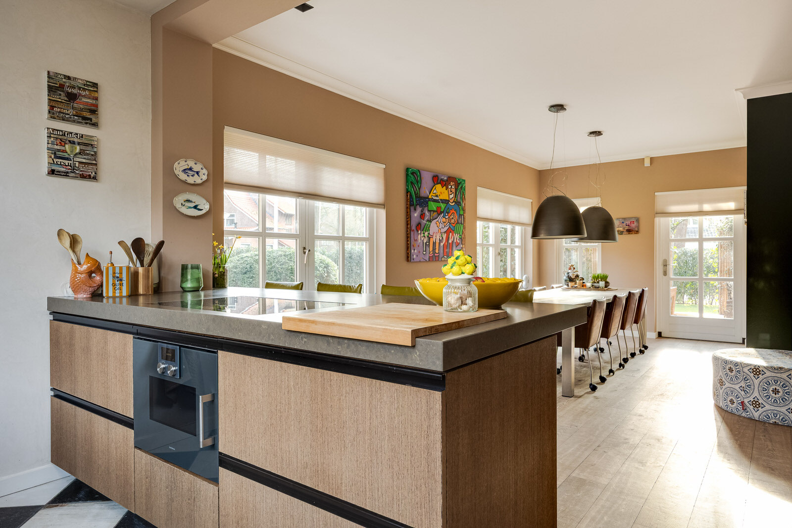 Via dubbele deuren loopt de leefruimte over in de royale woonkeuken — ontworpen als centrale leefplek. Maatwerk kastenwerk, composiet werkbladen en een kookeiland met barfunctie vormen een mooi geheel. Alle apparatuur is van Gaggenau: oven, combi-oven, inductiekookplaat, vaatwasser, koelkast, vriezer met ijs- en waterfunctie en Quooker.